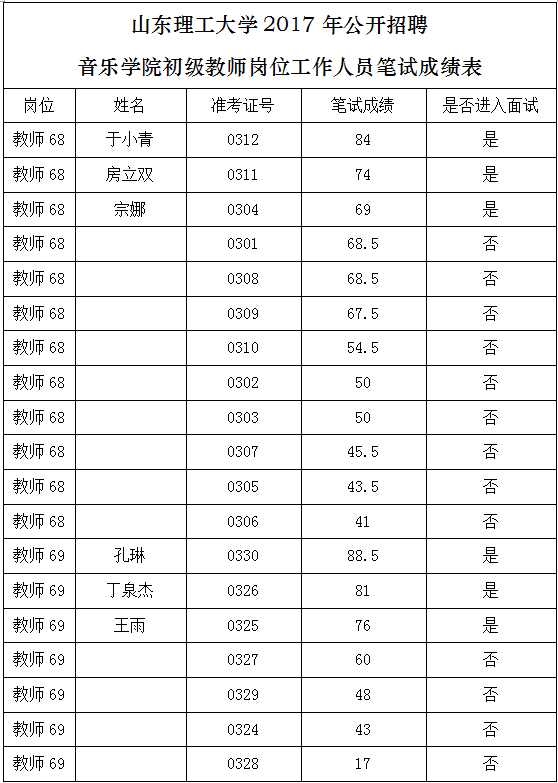现将6月17日初级教师岗位笔试成绩予以公告,同时根据笔试成绩由高分到低分按1:3比例依次确定进入面试人选。请进入面试人员6月18日早上8:00在西校区10#教学楼247办公室报到参加面试。