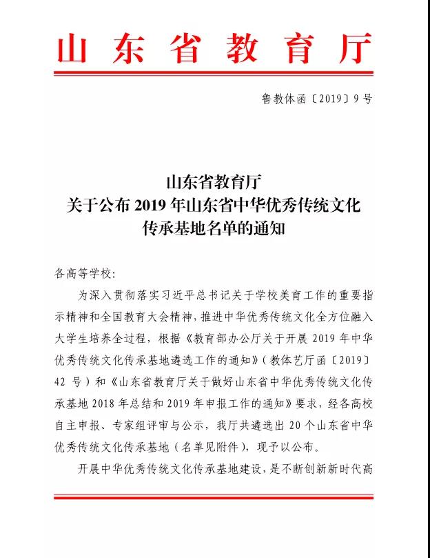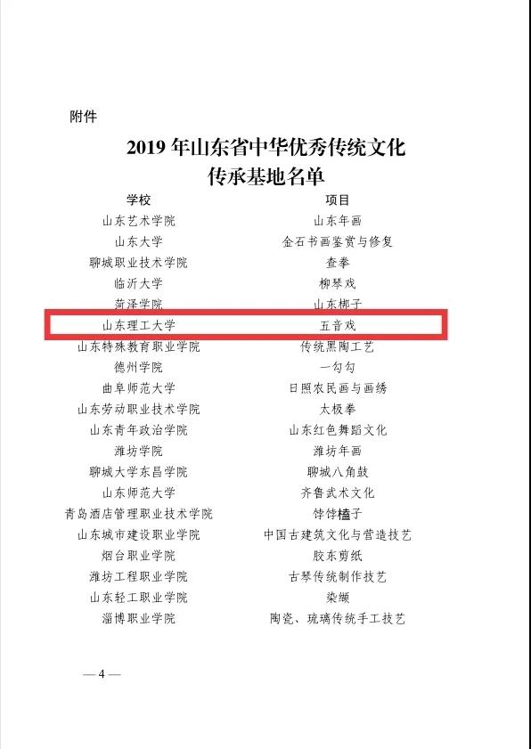 为深入贯彻落实习近平总书记关于公司美育工作的重要指示精神和全国教育大会精神,推进中华优秀传统文化全方位融入老员工培养全过程,根据教育部办公厅《关于开展2019年中华优秀传统文化传承基地遴选工作的通知》(教体艺厅函〔2019〕42号)和山东省教育厅《关于做好山东省中华优秀传统文化传承基地2018年总结和2019年申报工作的通知》要求,经各高校自主申报、专家组评审,山东省教育厅共遴选20个山东省中华优秀传统文化传承基地,其中伟德国际VICTOR1946五音戏传承基地名列其中。