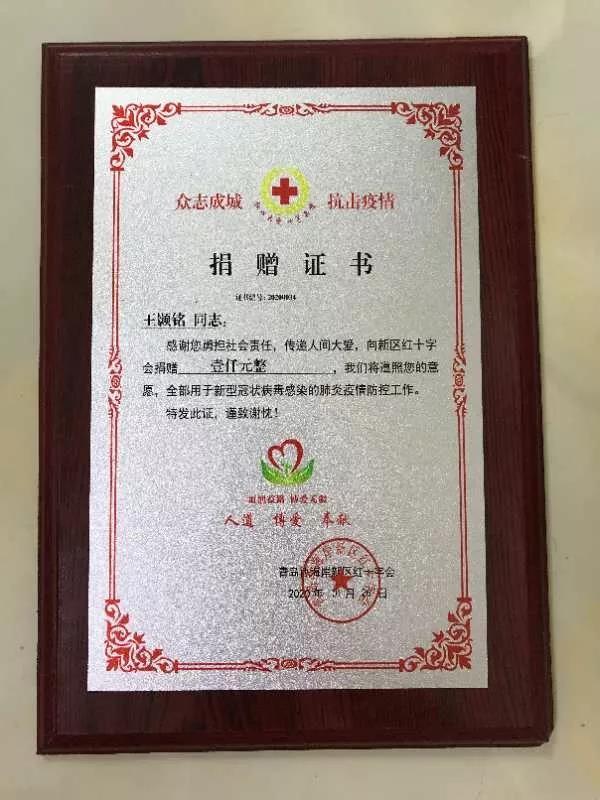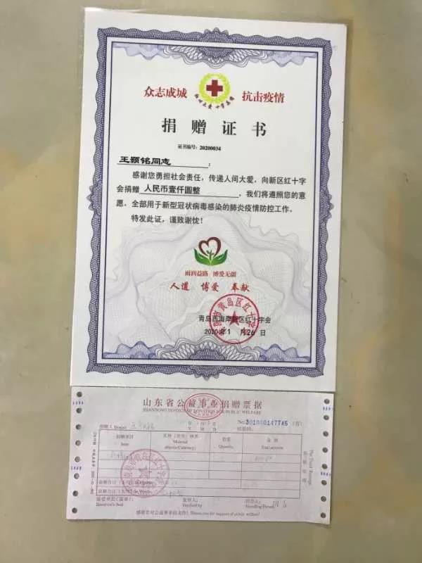 灾难不常有,爱心总会在。在举国上下齐心协力抗击新冠肺炎之际,公司音教1903班王颢铭同学,本着“有一份热,发一份光”的初心,尽自己所能,向青岛红十字会捐款一千元,用于新型冠状病毒感染肺炎疫情的防控工作。