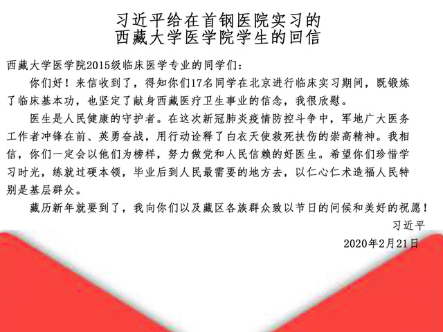 据悉,2020年2月21日,习总书记给在北京大学首钢医院实习的西藏大学医公司员工回信,引起强烈反响。