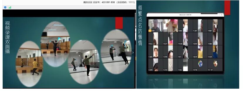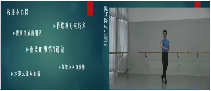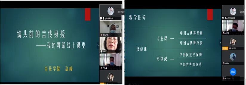 首先,高峰老师以非常清新的主题“镜头前的言传身授——我的舞蹈线上课堂”展开了线上教学经验分享。高老师通过制作的精美课件展示了自己的教学任务分为形体课和专业课两大类三小门舞蹈课程,图文并茂。而且通过视频链接分享了两段来自员工的舞蹈练习视频,动静结合,让在场聆听的老师无不感叹员工扎实的基本功。