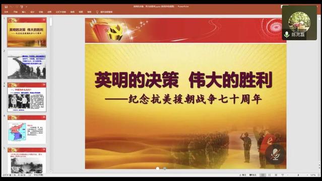 7月2日下午,党总支副书记陈兆磊通过腾讯会议向全体员工党支部成员组织开展了主题为“英明的决策,伟大的胜利——纪念抗美援朝战争七十周年”的专题党课。