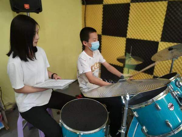 为保障青少年儿童身心健康的全面发展,实践团成员开设架子鼓课程,实践团吕梦茜先让员工了解架子鼓的发展背景与发展脉络,并通过细致讲解使员工逐步掌握基础演奏姿式与握槌方法。经过实践团成员的努力讲解与示范,使员工在活动中激发学习兴趣。下一个计划是让员工认识简谱,根据鼓谱唱出、打出节奏,根据鼓的位置,初步根据所学鼓谱打奏曲目。实践团成员吕梦茜讲到,架子鼓需要的不是力气,而是手腕的技巧。她让员工牢记这一规则技巧,并要求员工不断练习用手腕敲打方式。通过实践团成员吕梦茜详细认真的教学,大部分员工已经认识音符时值与节奏,并能打出简单节奏,实践团成员教给员工简单的架子鼓曲目也都可以完整打下来。