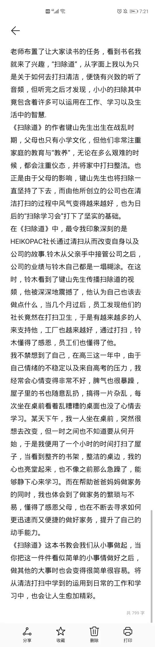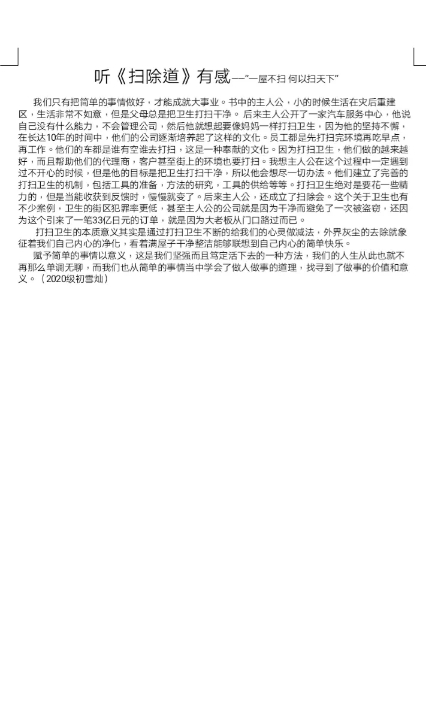 我不禁想到了自己,在高三这一年中,由于自己情绪的不稳定以及来自高考的压力,我经常会心情变得非常不好,脾气也很暴躁,屋子里的书也随意乱扔,搞得一-片杂乱,每次坐在桌前看着乱糟糟的桌面也没了心情去学习。某天下午,我一人坐在桌前,突然很想去改变,但一时之间也不知道要从何开始,于是我便用了一个小时的时间打扫了屋子,当看到整齐的书架,整洁的桌边,我的心也亮堂起来,也不像之前那么急躁了,能够静下心来学习。而在帮助爸爸妈妈做家务的同时,我也体会到了做家务的繁琐与不易,懂得了感恩父母,也在不断去寻求如何更迅速而又便捷的做好家务,提升了自己的动手能力。《扫除道》这本书教会我们从小事做起,当你把这一件件看似简单的小事情做好之后,做其他的大事时也会变得很简单很容易。将从清洁打扫中学到的运用到日常的工作和学习中,也会让人生愈加精彩。