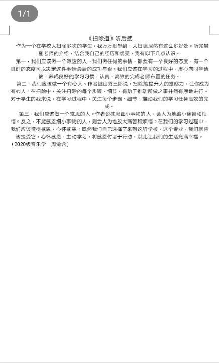马上就要步入大学,马上就要开启新的人生篇章,必须学会这种扫除道的精神,对自己做一个清醒的认识,重新要求自己,使自己变得细心感性,使自己变得更加谦虚灵敏,做到凡事彻底”,践行”扫除道”精神。