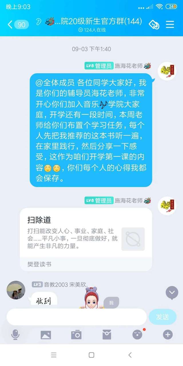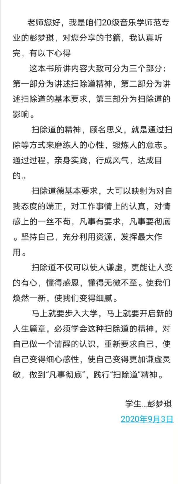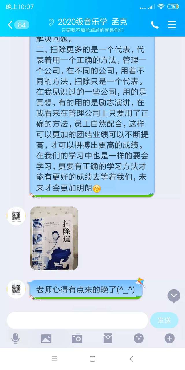 9月3日,公司2020级新生辅导员施海花老师,组织新生听《扫除道》一书的音频,并鼓励同学们在家体验扫除的乐趣和撰写读后感在群里相互分享,通过智慧的分享可以引起大家的共鸣,思想引领行动,当大家接纳了扫除的意义后再进行劳动,少的是抱怨,多的是喜悦。“扫除不仅仅是打扫卫生,背后蕴含着无限的能量,关于扫除,如不亲身体验,往往易流于表面的肤浅理解,只有亲自去实践,去感受,找到那份喜悦的感觉,就会产生一种共鸣。”