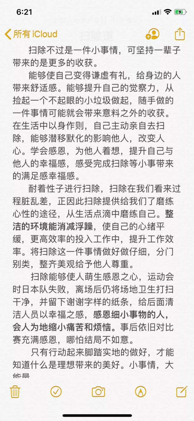 扫除能够使人萌生感恩之心,运动会时日本队失败,离场后仍将场地卫生打扫干净,并留下谢谢字样的纸条,给后面清洁人员以幸福之感,感恩细小事物的人,会人为地缩小痛苦和烦恼。事后依旧对比赛充满感恩,哪怕结局不如意。只有行动起来脚踏实地的做好,才能知道什么是理想带来的美好。小事情,大能量。