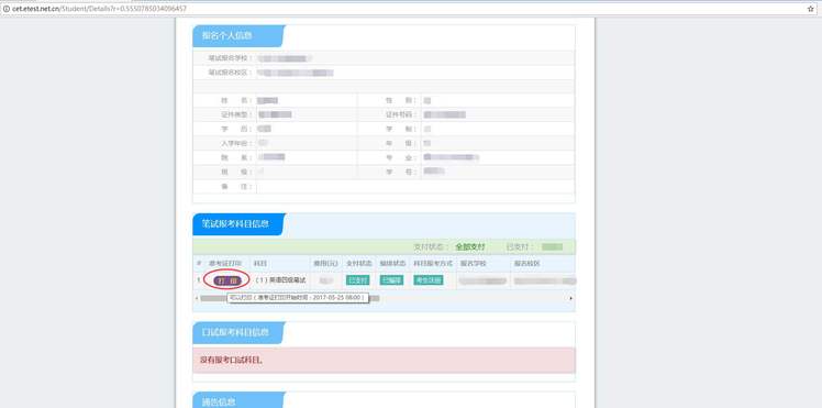 第四步: 进入报名信息页面。滚动页面到要打印准考证的科目信息处,在第一列“准考证打印”会显示当前准考证打印状态,鼠标放上去会提示具体时间信息。在打印时间内,点击“打印”,即可下载对应科目准考证。