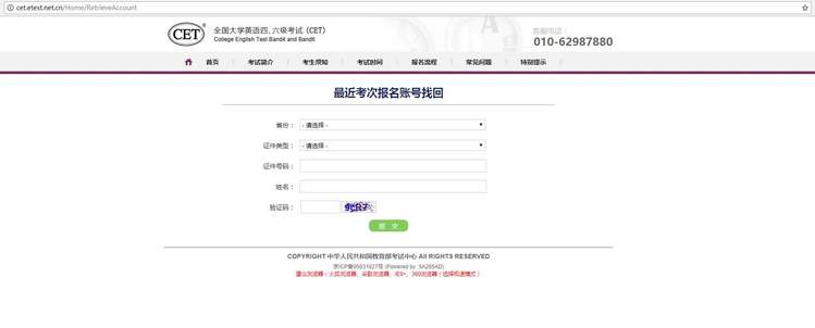 第六步: 打开“最近考次报名账号找回”页面。输入报名时的个人信息,点击“提交”,即可找回报名时的通行证账号信息。然后可按第一步流程登录系统,打印准考证。