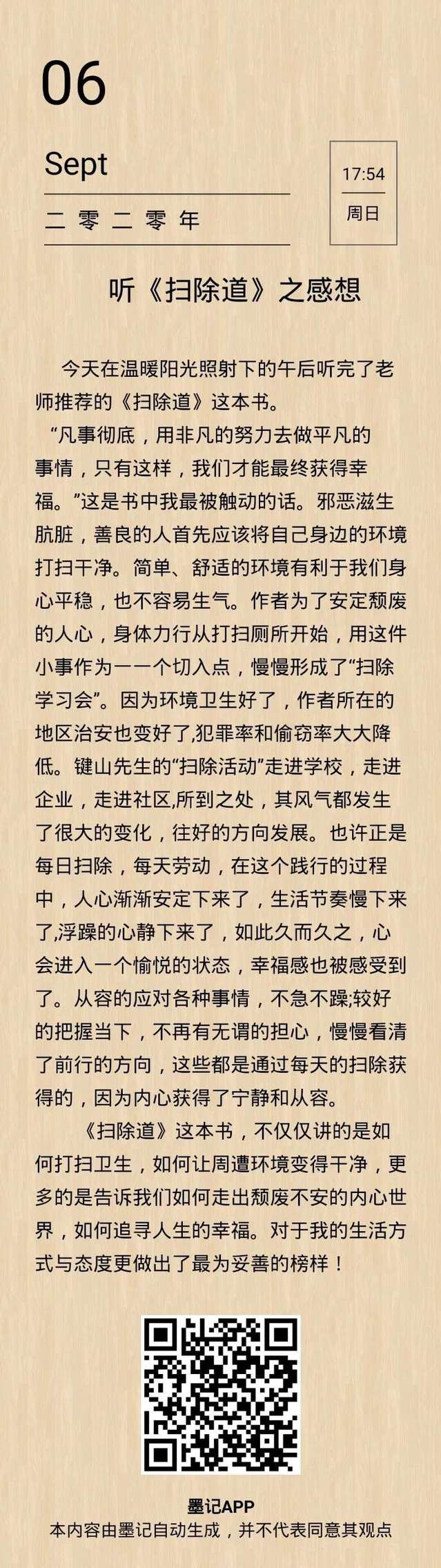 今天在温暖阳光照射下的午后听完了老师推荐的《扫除道》这本书。