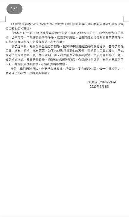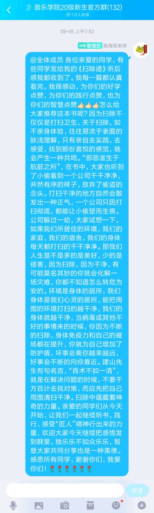 9月3日,公司2020级新生辅导员施海花老师,组织新生听《扫除道》一书的音频,并鼓励同学们在家体验扫除的乐趣和撰写读后感在群里相互分享,通过智慧的分享可以引起大家的共鸣,思想引领行动,当大家接纳了扫除的意义后再进行劳动,少的是抱怨,多的是喜悦。“扫除不仅仅是打扫卫生,背后蕴含着无限的能量,关于扫除,如不亲身体验,往往易流于表面的肤浅理解,只有亲自去实践,去感受,找到那份喜悦的感觉,就会产生一种共鸣。”