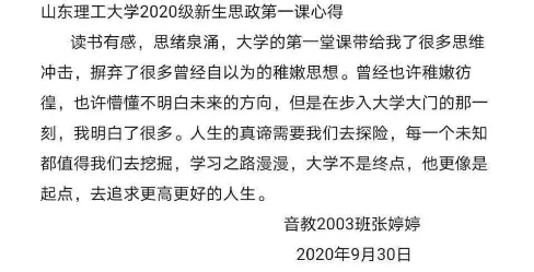 今天,我怀着无比崇敬且激动的心情迎来了由公司吕传毅书记为我们新生讲述的第一课。吕书记给我们讲述了出生于普通家庭却有无比伟大的思想观念的马克思;站在人民的立场,坚持“我将无我,不负人民”投身于强国事业的习总书记;84岁高龄“挂帅出征”的钟南山院士。这些影响国家甚至影响世界的伟大人物,都是我们青年学习的楷模。我们的山理工也是英雄和楷模的沃土,有取得突出成绩的科学家,有舍己为人的英雄飞行员……他们都是我们的青春偶像!我们会制定明确且清晰的目标,刻苦学习,努力实践,努力成长为可堪民族复兴大任的新时代青年!