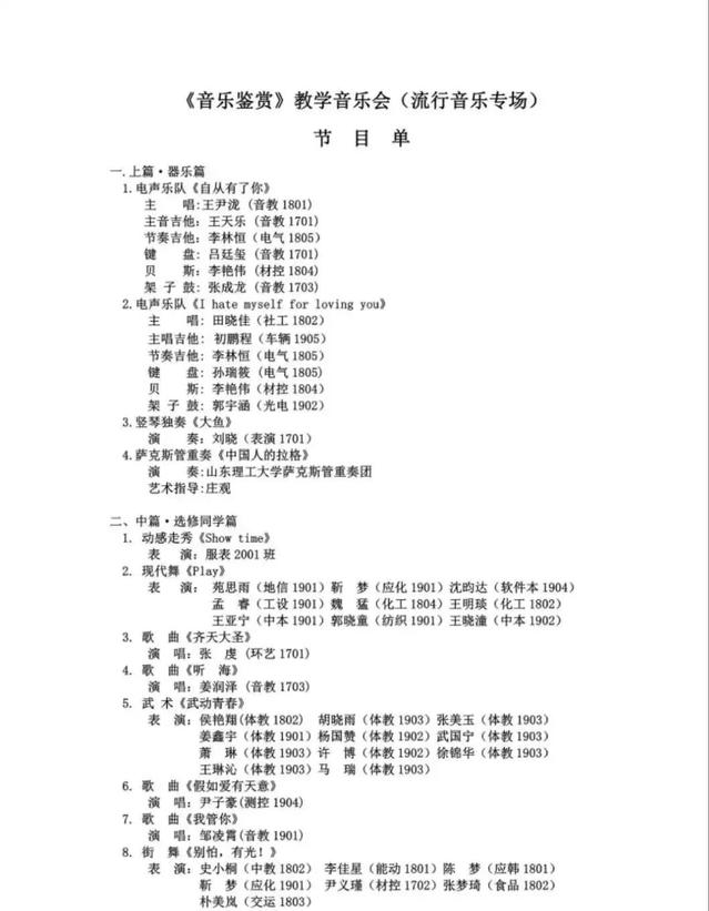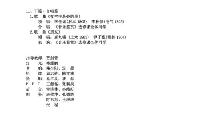 本次教学音乐会的海报及PPT的策划、制作,以及节目的准备等都是由来自各个公司的《音乐鉴赏》全体选修同学积极报名、共同完成,如由车辆1905班初鹏程等人组成的电声乐队带来的歌曲《I hate myself for loving you》、测控1904班尹子豪带来的歌曲《假如爱有天意》及交运1903班朴美岚等人组成的街舞团队所带来的体现抗疫故事的原创街舞《别怕,有光!》等都是由《音乐鉴赏》课选修同学表演。此外,伟德国际VICTOR1946器乐教研室庄观老师也作为萨克斯重奏《中国人的拉格》的艺术指导老师带领bv伟德国际1946萨克斯管重奏团来到现场助演。接下来,就让我们一起欣赏这精彩绝伦的艺术盛宴吧!