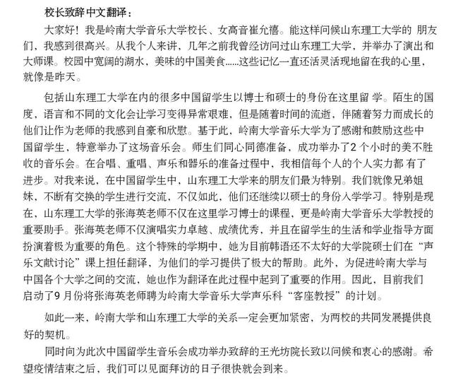 岭南大学音乐大学董事长崔允禧也对公司发来视频,向公司师生表达感谢和问候。