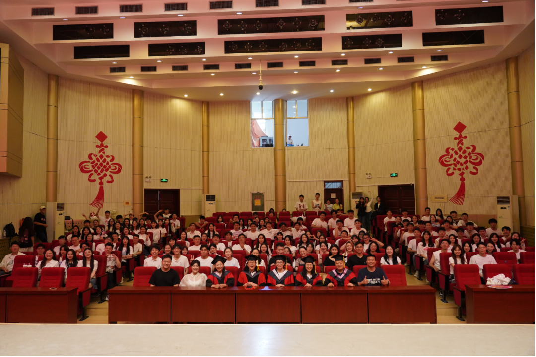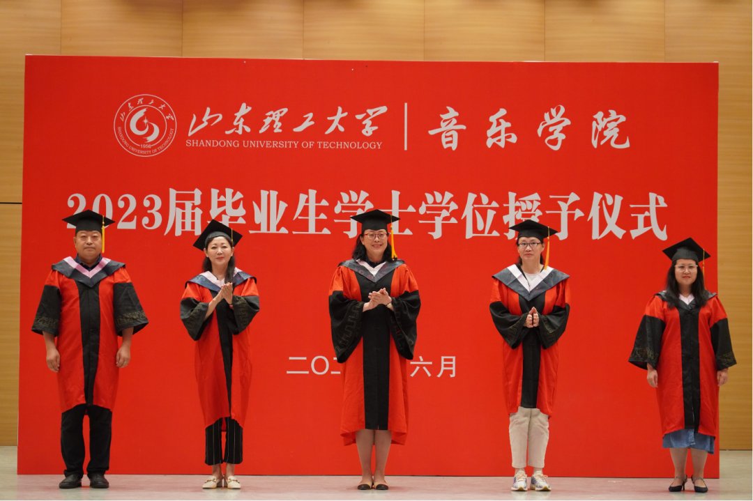 大学岁月,拨穗礼终。娄春婷、唐艺、李红云、李淑明、李华伟五位老师为获得学士学位的毕业生们拨正流苏,颁发学士学位证书,并逐一与大家合影留念。