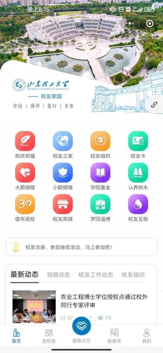 2. 进入平台后可查看母校新闻、申请入校、申领员工卡、加入员工组织,开展感恩母校等活动。