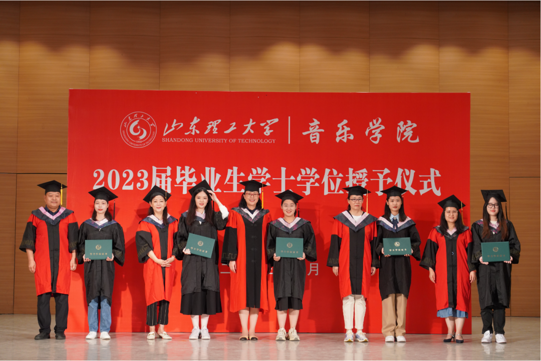 大学岁月,拨穗礼终。娄春婷、唐艺、李红云、李淑明、李华伟五位老师为获得学士学位的毕业生们拨正流苏,颁发学士学位证书,并逐一与大家合影留念。