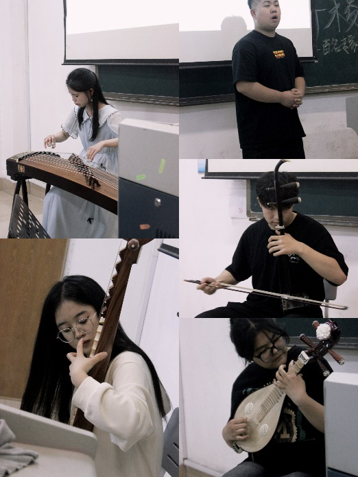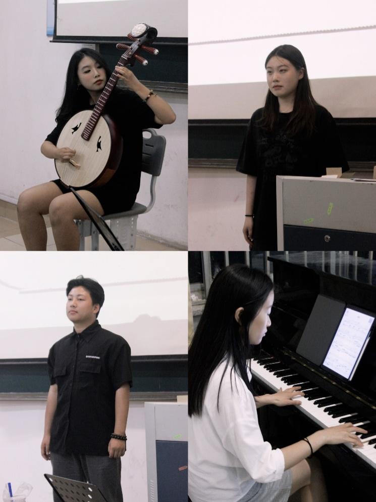 音教2302班同学在听完老师的讲授之后,充分感受到了传统乐器与古代诗词的魅力,踊跃进行传统乐器和民歌表演,将专业文化与传统文化相结合,展示传统文化的魅力。于明玉同学带来的中阮表演《南泥湾》,欧阳江柏同学演唱的《沁园春•雪》,周义坤同学带来的二胡演奏《赛马》,杨子瑶、赵子艳带来的古筝钢琴合奏《雨莲花开》,栾玉俐演唱《定风波》,王雨晴带来琵琶表演《采蘑菇的小姑娘》,崔志鹏同学带来的演唱《天路》。同学们纷纷展示自己的收获成果。