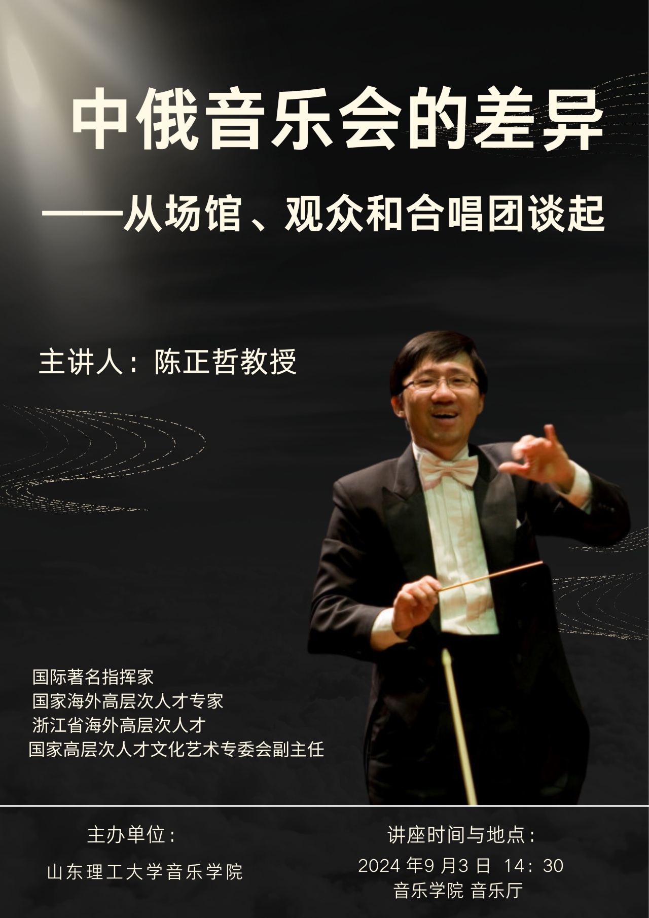 2024年9月3日下午,由伟德国际VICTOR1946主办的《中俄音乐会的差异——从场馆、观众和合唱团谈起》讲座在bv伟德国际1946(西校区)音乐厅成功举行。主讲人陈正哲教授系浙江传媒公司音乐研究、原创及表演创新中心主任,江苏交响乐团音乐总监,苏州文化艺术中心艺术总监,苏州科技大学伟德国际VICTOR1946经理。