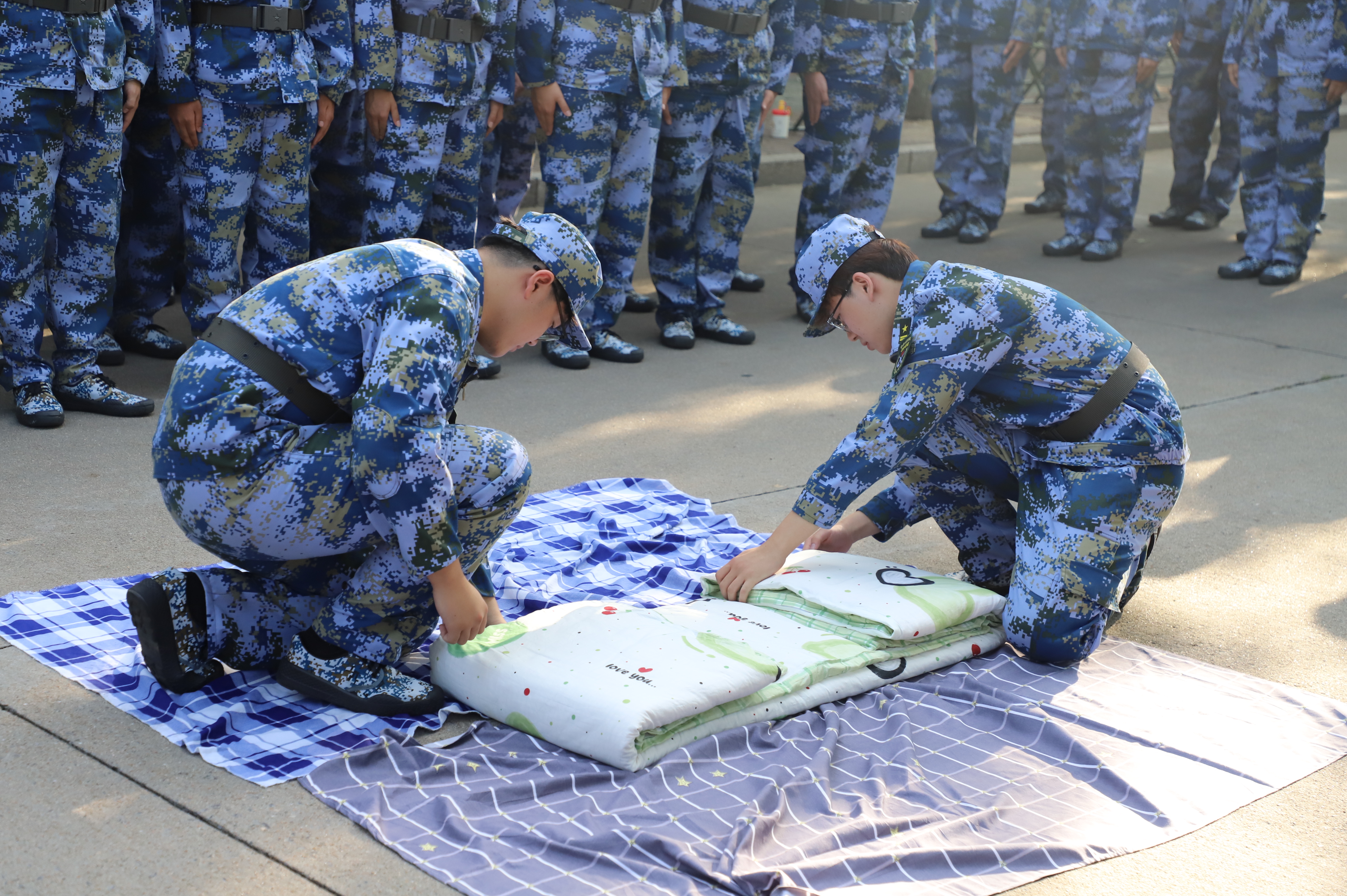 军被三分叠,七分修,细微之处见精神,用标准度量行动,以坚持磨砺人生。“小音符”们摩拳擦掌,各显神通,一个个方方正正的被子,体现着他们的精神风貌。