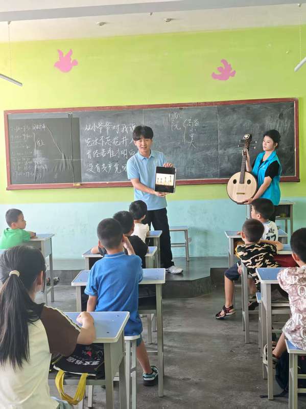 接着,实践团成员为孩子们带来了民族乐器中阮的科普。成员们拿着中阮,详细地介绍了它的构造、发声原理和演奏技巧。孩子们围坐在一起,好奇地观察着中阮,不时提出各种问题。实践团成员一边耐心解答,一边现场演奏了一段优美的乐曲。那悠扬的旋律在空气中回荡,孩子们都被深深吸引住了,纷纷发出惊叹声。通过这次科普,孩子们对民族乐器有了更深入的了解,也感受到了中华传统文化的魅力。