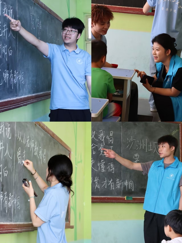 随后,进入了本次活动的重点环节——《在灿烂的阳光下》歌曲教唱。实践团成员先向孩子们介绍了歌曲的背景故事和创作意义,让他们明白这首歌所蕴含的对党的感恩和对美好生活的向往。在教唱过程中,成员们一句一句地教,孩子们认真地跟着学。遇到困难的乐句,成员们就带着孩子们通过读歌词、打节奏的方式反复练习。孩子们学得十分投入,歌声越来越响亮,越来越整齐。在欢快的歌声中,孩子们仿佛看到了在党的关怀下,自己生活发生的巨大变化,脸上洋溢着幸福的笑容。