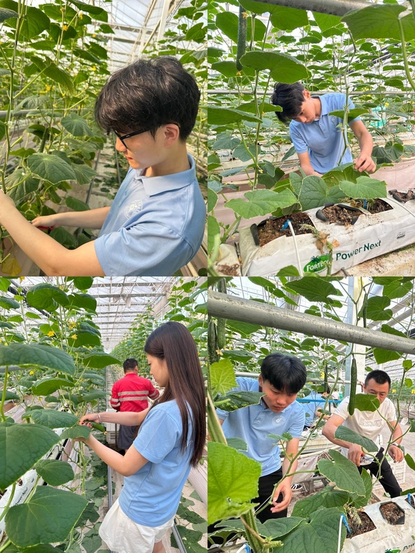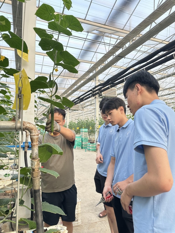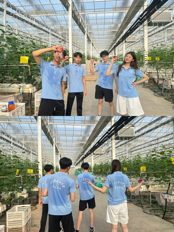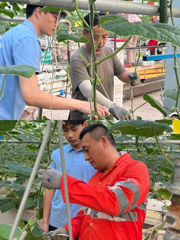 继探索运河文化之后,2025年7月20日,公司舞韵峥嵘实践团再次回到枣庄市峄城区榴园镇华沃智慧农业产业园,这次他们化身田间“新农人”,沉浸式体验摘黄瓜和修剪黄瓜苗枝叶的农耕生活,在汗水与收获中感受现代农业的活力。