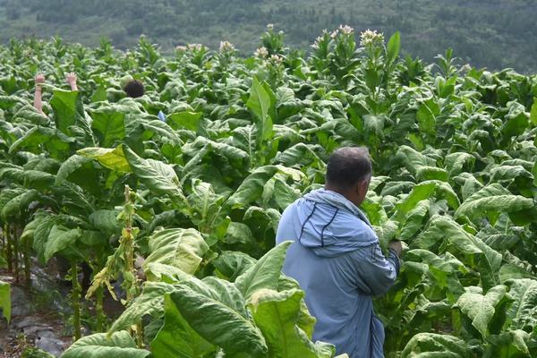 清晨的烟田郁郁葱葱,大片烟叶舒展着宽厚的叶片,在阳光下泛着油绿的光泽。实践团的同学们跟着烟农走进田间,首先了解到烟叶生长的关键一步——“打头”。“这烟株长到一定时候,顶端会开花,必须把花掐掉,养分才能全供到叶子上,烟叶才能长得厚实。”烟农一边演示“打头”的动作,一边解释其中的门道。同学们听得认真,还亲手尝试了一番,指尖触到细嫩的花枝,才明白这看似简单的操作,竟是保证烟叶品质的关键。