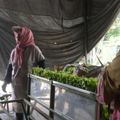 上午的重头戏是采烟与压烟。成熟的烟叶要从下往上分批采摘,烟农教大家如何辨别叶片的成熟度:“颜色深绿、手感厚实的,中间杆部发白,就是能采的了。”同学们小心翼翼地捏住叶柄,轻轻一掰,一片完整的烟叶便采了下来。不一会儿,竹筐里就堆起了青绿的“收获”。采下的烟叶需及时压烟,实践团的同学们立刻加入村民的行列:将烟叶整齐铺开,一层叠着一层码好,再在上面压上沉重的木板和石块,利用重力让烟叶紧实脱水。同学们挽着袖子,合力搬抬重物,汗水顺着脸颊滑落,却挡不住参与劳作的热情。