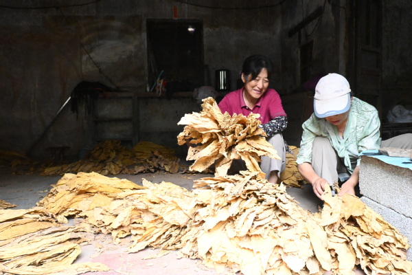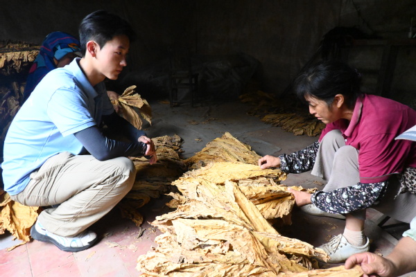 下午,实践团成员来到烟叶分拣场地,参观了解烟叶的分拣和等级划分过程。工作人员详细介绍道,烟叶的分级有着严格的标准,烘烤完好的烟叶需要色泽均匀、无斑点且完整度高。实践团成员认真观察每一个环节,学习如何根据烟叶的颜色、质地、大小等特征进行准确分类。通过此次参观学习,成员们对烟叶产业有了全新的认识,深刻体会到了农民劳作的辛苦与智慧。
