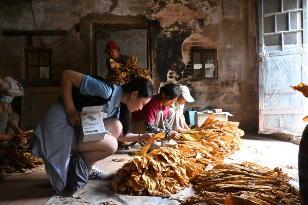 下午,实践团成员来到烟叶分拣场地,参观了解烟叶的分拣和等级划分过程。工作人员详细介绍道,烟叶的分级有着严格的标准,烘烤完好的烟叶需要色泽均匀、无斑点且完整度高。实践团成员认真观察每一个环节,学习如何根据烟叶的颜色、质地、大小等特征进行准确分类。通过此次参观学习,成员们对烟叶产业有了全新的认识,深刻体会到了农民劳作的辛苦与智慧。