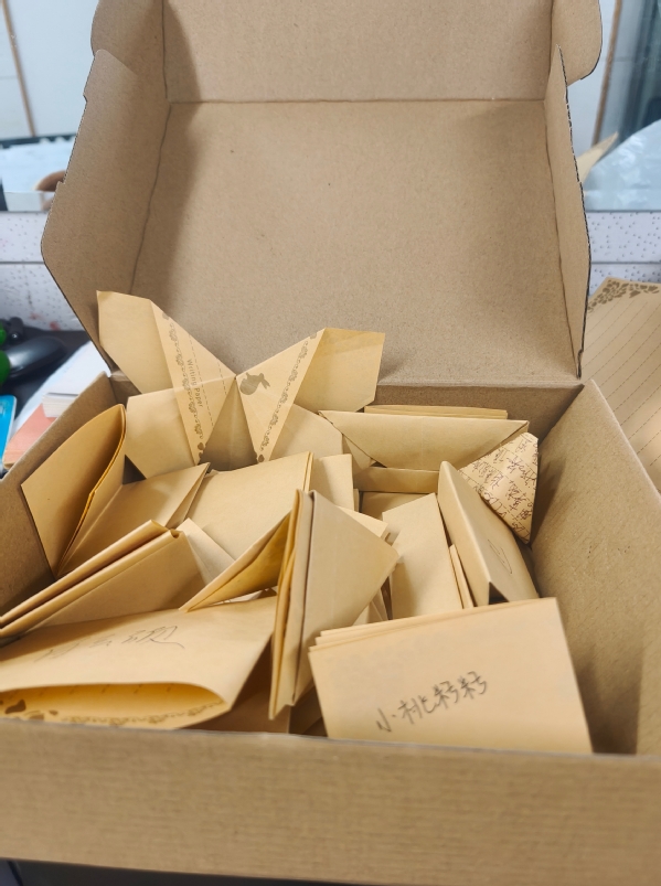 书写完毕,同学们小心翼翼地按照自己的心意,将信纸折叠成形态各异的形状——象征平稳的纸船、寓意希望的千纸鹤、代表幸运的星星……随后,大家共同装饰那个承载着集体记忆的“时间胶囊”——一个精心准备的大号密封盒。同学们拿起画笔,让原本朴素的胶囊外壳,变成了一件注入集体灵感的艺术品,凝聚了音教2401班全体同学此刻的共同情感与集体印记。