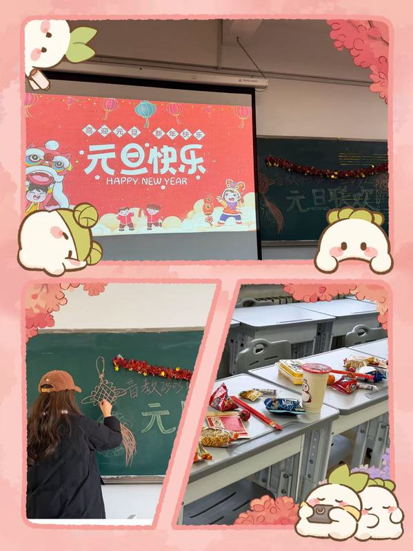 活动开始前,班委们早早来到教室,化身“后勤小分队”忙碌不停。大家齐心协力布置场地,缤纷的彩带将教室装点得焕然一新;精心准备的零食饮料整齐摆放,更暖心的是,班委们还为每位同学手写了新年祝福语,字里行间满是温暖的期许。